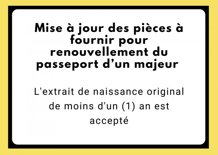Nous informons les ressortissants sénégalais établis au Royaume-Uni que le renouvellement du passeport peut être effectué à nouveau en présentant l’original de l’extrait de naissance datant de moins d’un (1) an.